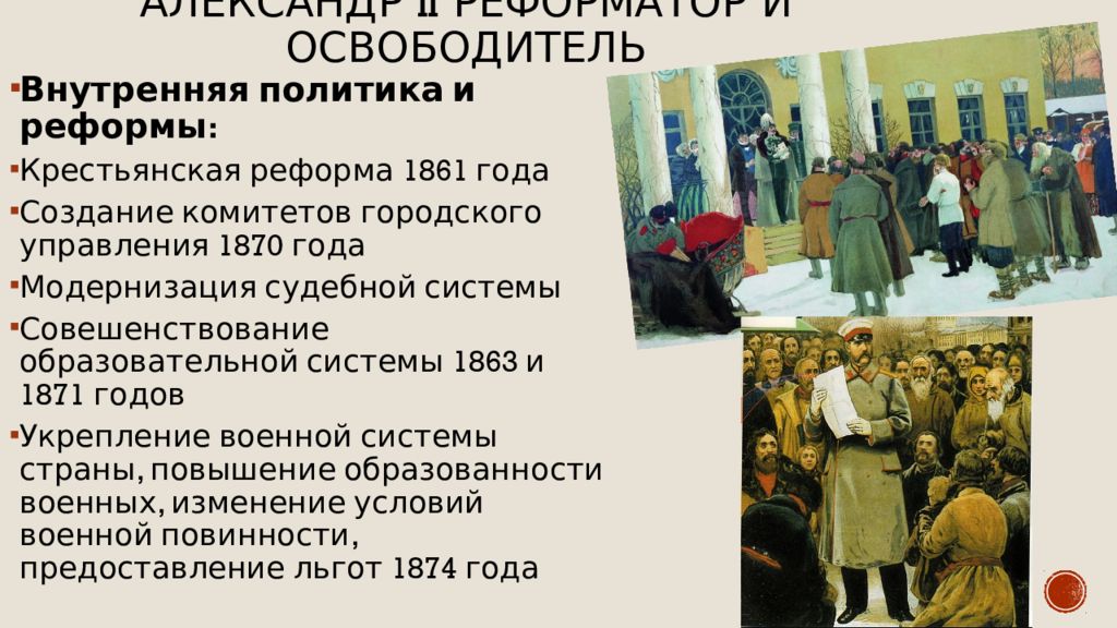 Внутренняя политика и реформы : Крестьянская реформа 1861 года Создание комитетов городского управления 1870 года Модернизация судебной системы Совешенствование образовательной системы 1863 и 1871 годов Укрепление военной системы страны, повышение образованности военных, изменение условий военной повинности, предоставление льгот 1874 года