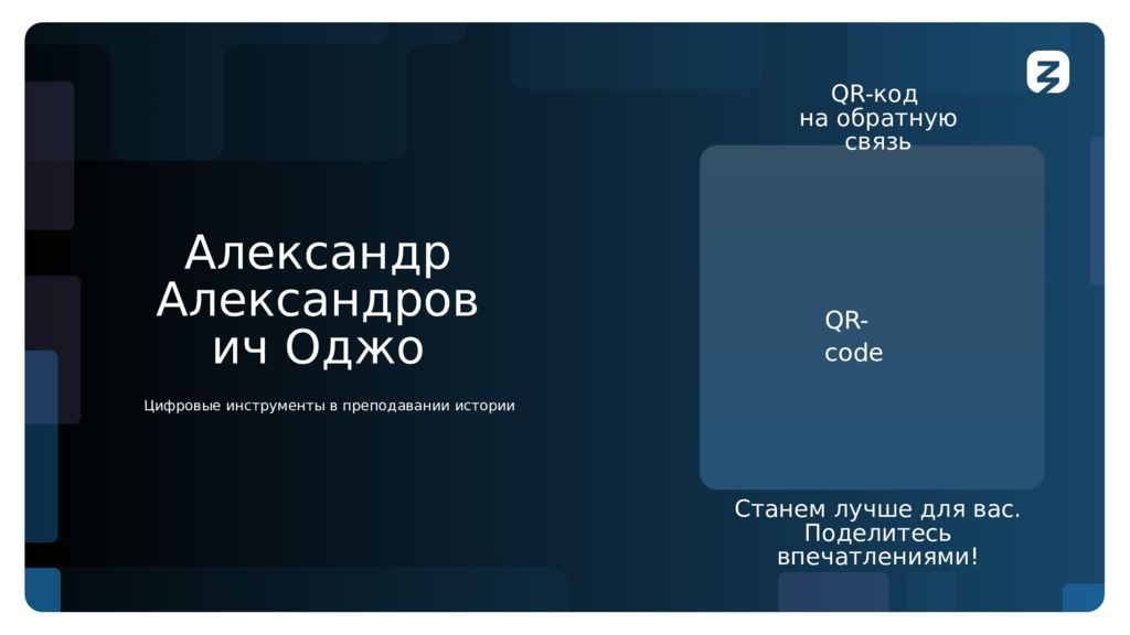 Александр Александрович Оджо QR-код на обратную связь QR-code Станем лучше для вас. Поделитесь впечатлениями! Цифровые инструменты в преподавании истории