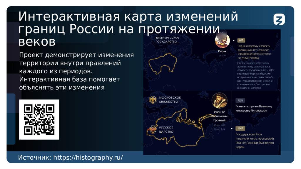 Изображение Проект демонстрирует изменения территории внутри правлений каждого из периодов. Интерактивная база помогает объяснять эти изменения Источник : https://histography.ru/ Интерактивная карта изменений границ России на протяжении веков