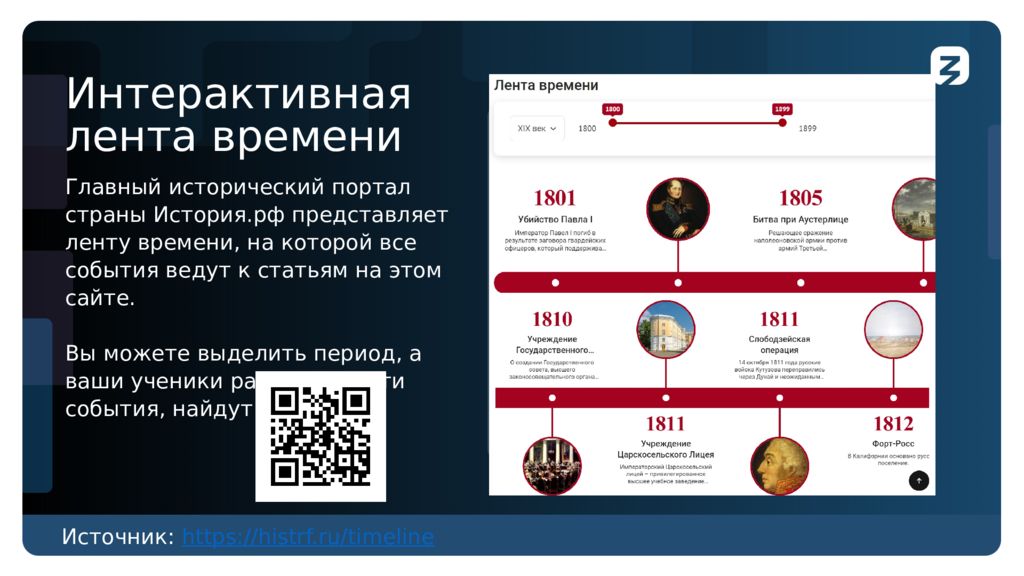 Интерактивная лента времени Изображение Главный исторический портал страны История.рф представляет ленту времени, на которой все события ведут к статьям на этом сайте. Вы можете выделить период, а ваши ученики рассмотрят эти события, найдут связи Источник : https://histrf.ru/timeline