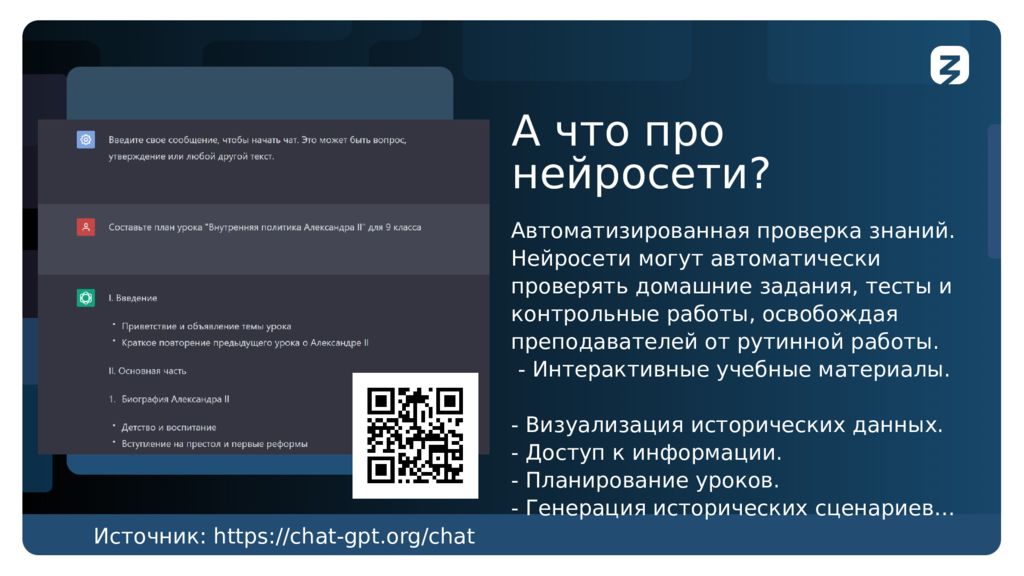 А что про нейросети ? Изображение Автоматизированная проверка знаний. Нейросети могут автоматически проверять домашние задания, тесты и контрольные работы, освобождая преподавателей от рутинной работы. - Интерактивные учебные материалы. - Визуализация исторических данных. - Доступ к информации. - Планирование уроков. - Генерация исторических сценариев… Источник : https://chat-gpt.org/chat