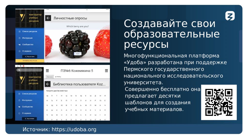 Создавайте свои образовательные ресурсы Изображение Изображение Многофункциональная платформа « Удоба » разработана при поддержке Пермского государственного национального исследовательского университета. Источник : https://udoba.org Совершенно бесплатно она предлагает десятки шаблонов для создания учебных материалов.