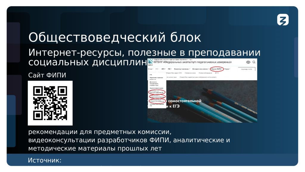 Обществоведческий блок Интернет-ресурсы, полезные в преподавании социальных дисциплин Сайт ФИПИ рекомендации для предметных комиссии, видеоконсультации разработчиков ФИПИ, аналитические и методические материалы прошлых лет Источник : https ://dzen.ru/a/YKNGi8dkDA6zsIRk