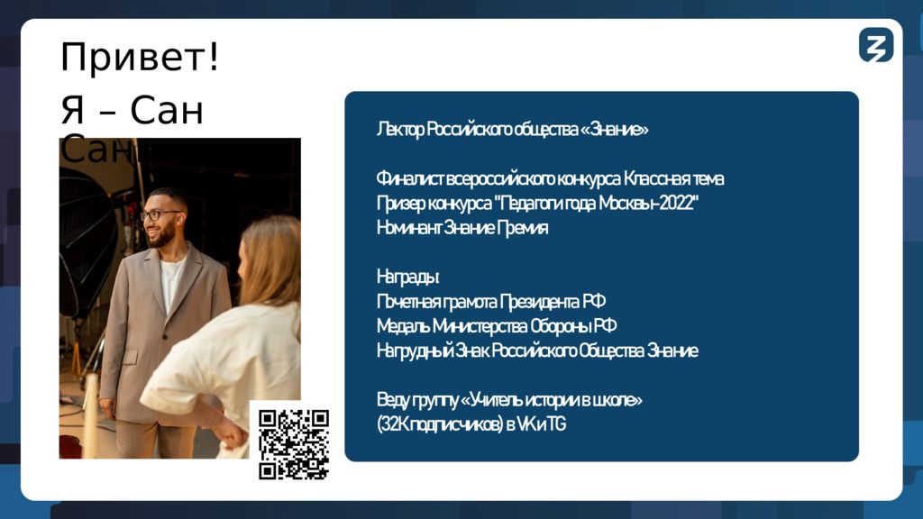 Лектор Российского общества «Знание» Финалист всероссийского конкурса Классная тема Призер конкурса "Педагоги года Москвы-2022" Номинант Знание Премия Награды: Почетная грамота Президента РФ Медаль Министерства Обороны РФ Нагрудный Знак Российского Общества Знание Веду группу «Учитель истории в школе» (32К подписчиков ) в VK и TG Привет! Я – Сан Саныч