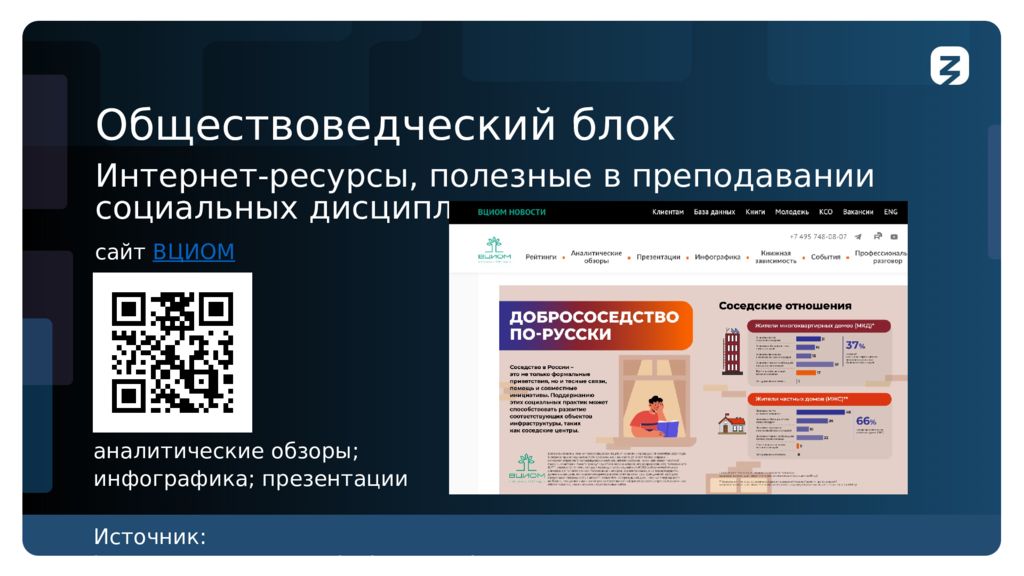 Обществоведческий блок Интернет-ресурсы, полезные в преподавании социальных дисциплин сайт ВЦИОМ аналитические обзоры; инфографика ; презентации Источник : https ://dzen.ru/a/YKNGi8dkDA6zsIRk