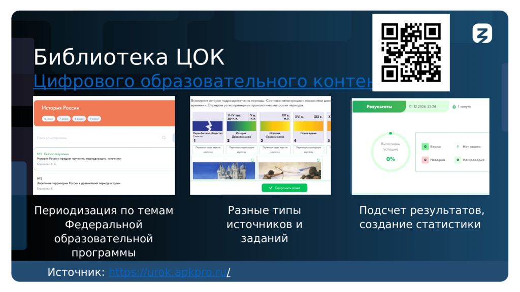 Подсчет результатов, создание статистики Разные типы источников и заданий Периодизация по темам Федеральной образовательной программы Изображение Изображение Изображение Библиотека ЦОК Цифрового образовательного контента Источник : https://urok.apkpro.ru /