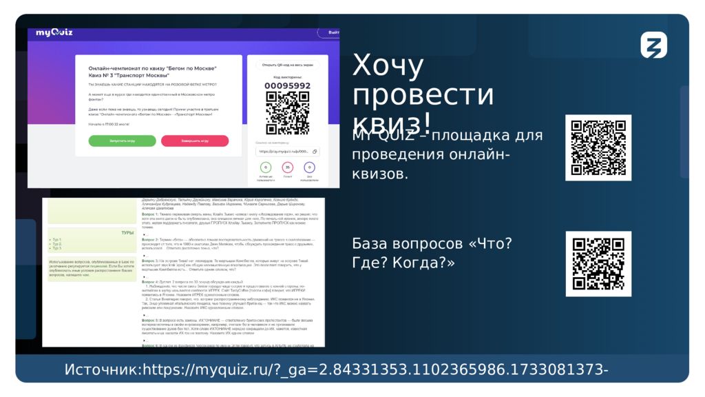Хочу провести квиз ! Изображение Изображение MY QUIZ – площадка для проведения онлайн- квизов. Источник:https ://myquiz.ru/?_ ga =2.84331353.1102365986.1733081373-2114174751.1733081364 База вопросов «Что? Где? Когда?»