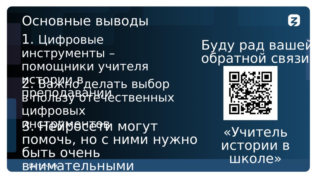 Основные выводы Источник: Буду рад вашей обратной связи «Учитель истории в школе» 1. Цифровые инструменты – помощники учителя истории в преподавании 2. Важно делать выбор в пользу отечественных цифровых инструментов 3. Нейросети могут помочь, но с ними нужно быть очень внимательными