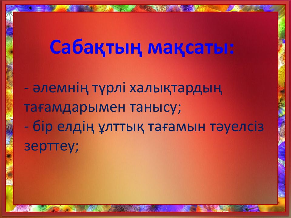 - әлемнің түрлі халықтардың тағамдарымен танысу; - бір елдің ұлттық тағамын тәуелсіз зерттеу;