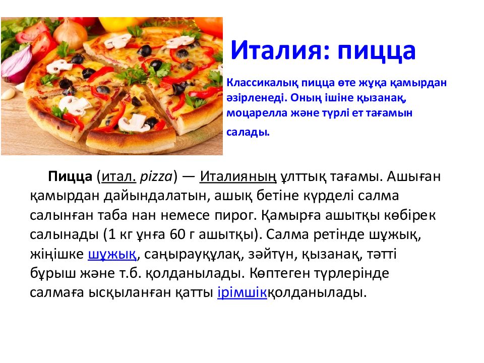 Классикалық пицца өте жұқа қамырдан әзірленеді. Оның ішіне қызанақ, моцарелла және түрлі ет тағамын салады. Пицца ( итал. pizza ) — Италияның ұлттық тағамы. Ашыған қамырдан дайындалатын, ашық бетіне күрделі салма салынған таба нан немесе пирог. Қамырға ашытқы көбірек салынады (1 кг ұнға 60 г ашытқы ). Салма ретінде шұжық, жіңішке шұжық, саңырауқұлақ, зәйтүн, қызанақ, тәтті бұрыш және т.б. қолданылады. Көптеген түрлерінде салмаға ысқыланған қатты ірімшік қолданылады.