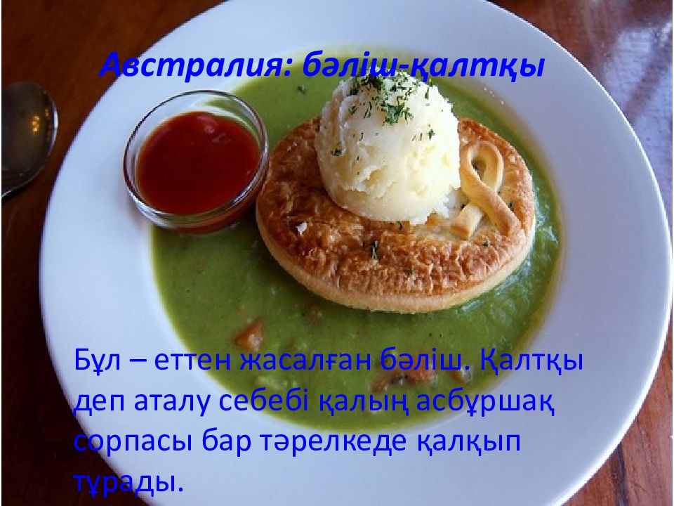 Австралия: бәліш-қалтқы Бұл – еттен жасалған бәліш. Қалтқы деп аталу себебі қалың асбұршақ сорпасы бар тәрелкеде қалқып тұрады.