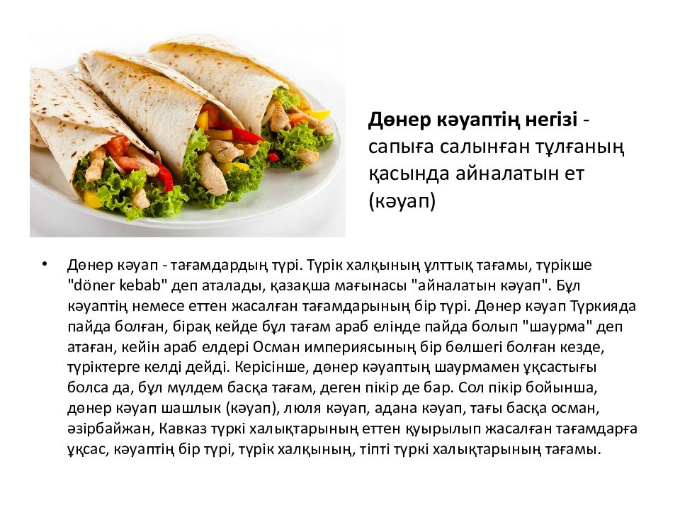 Дөнер кәуап - тағамдардың түрі. Түрік халқының ұлттық тағамы, түрікше " döner kebab" деп аталады, қазақша мағынасы " айналатын кәуап ". Бұл кәуаптің немесе еттен жасалған тағамдарының бір түрі. Дөнер кәуап Түркияда пайда болған, бірақ кейде бұл тағам араб елінде пайда болып " шаурма " деп атаған, кейін араб елдері Осман империясының бір бөлшегі болған кезде, түріктерге келді дейді. Керісінше, дөнер кәуаптың шаурмамен ұқсастығы болса да, бұл мүлдем басқа тағам, деген пікір де бар. Сол пікір бойынша, дөнер кәуап шашлык ( кәуап ), люля кәуап, адана кәуап, тағы басқа осман, әзірбайжан, Кавказ түркі халықтарының еттен қуырылып жасалған тағамдарға ұқсас, кәуаптің бір түрі, түрік халқының, тіпті түркі халықтарының тағамы. Дөнер кәуаптің негізі - сапыға салынған тұлғаның қасында айналатын ет ( кәуап )