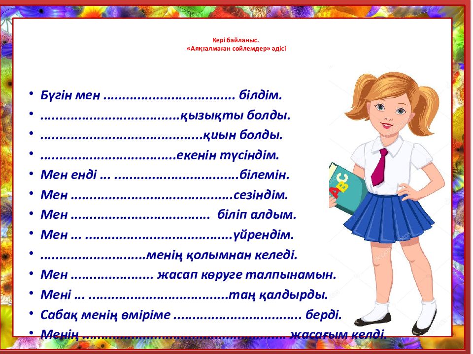 Слайд 27: Кері байланыс. «Аяқталмаған сөйлемдер» әдісі