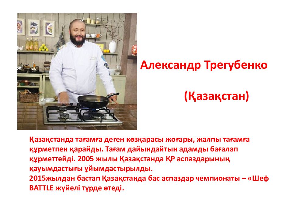 Александр Трегубенко ( Қазақстан ) Қазақстанда тағамға деген көзқарасы жоғары, жалпы тағамға құрметпен қарайды. Тағам дайындайтын адамды бағалап құрметтейді. 2005 жылы Қазақстанда ҚР аспаздарының қауымдастығы ұйымдастырылды. 2015жылдан бастап Қазақстанда бас аспаздар чемпионаты – «Шеф BATTLE жүйелі түрде өтеді.