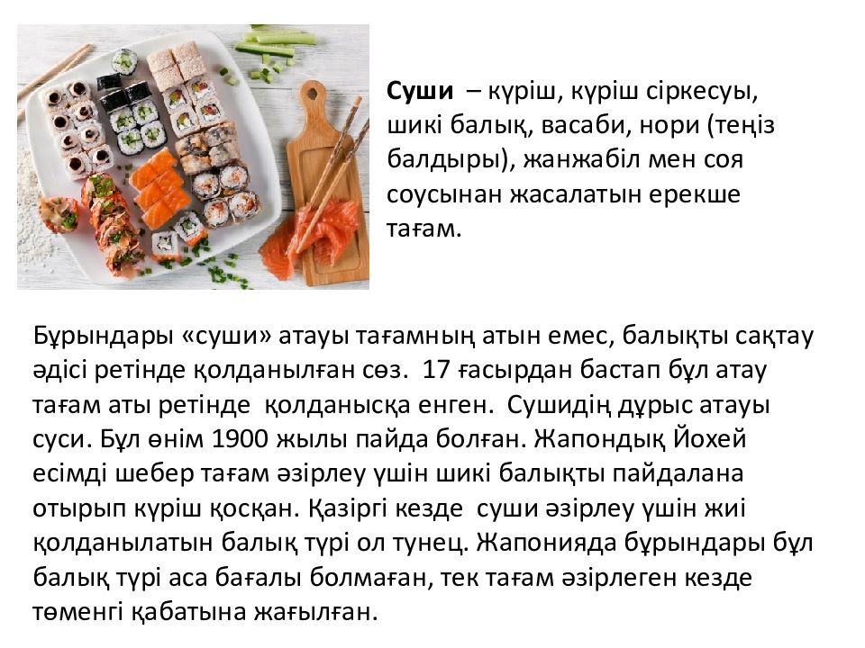 Бұрындары «суши» атауы тағамның атын емес, балықты сақтау әдісі ретінде қолданылған сөз. 17 ғасырдан бастап бұл атау тағам аты ретінде қолданысқа енген. Сушидің дұрыс атауы суси. Бұл өнім 1900 жылы пайда болған. Жапондық Йохей есімді шебер тағам әзірлеу үшін шикі балықты пайдалана отырып күріш қосқан. Қазіргі кезде суши әзірлеу үшін жиі қолданылатын балық түрі ол тунец. Жапонияда бұрындары бұл балық түрі аса бағалы болмаған, тек тағам әзірлеген кезде төменгі қабатына жағылған. Суши – күріш, күріш сіркесуы, шикі балық, васаби, нори ( теңіз балдыры ), жанжабіл мен соя соусынан жасалатын ерекше тағам.