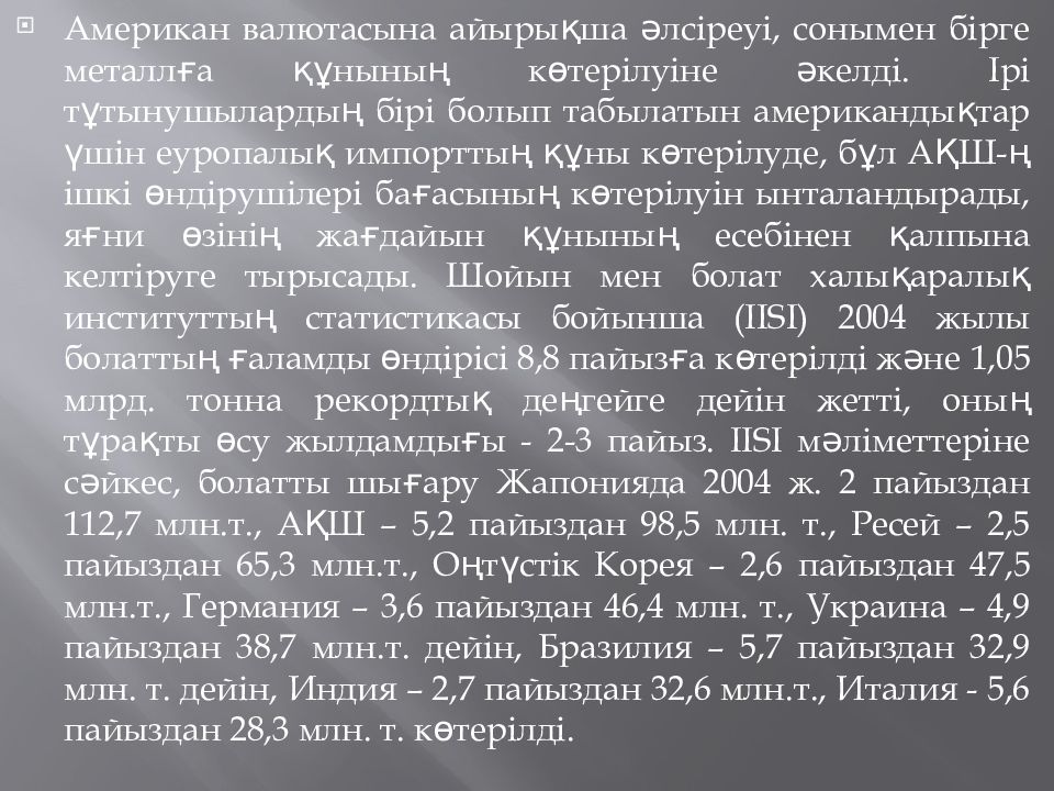 Американ валютасына айырықша әлсіреуі, сонымен бірге металлға құнының көтерілуіне әкелді. Ірі тұтынушылардың бірі болып табылатын американдықтар үшін еуропалық импорттың құны көтерілуде, бұл АҚШ-ң ішкі өндірушілері бағасының көтерілуін ынталандырады, яғни өзінің жағдайын құнының есебінен қалпына келтіруге тырысады. Шойын мен болат халықаралық институттың статистикасы бойынша ( IISI) 2004 жылы болаттың ғаламды өндірісі 8,8 пайызға көтерілді және 1,05 млрд. тонна рекордтық деңгейге дейін жетті, оның тұрақты өсу жылдамдығы - 2-3 пайыз. IISI мәліметтеріне сәйкес, болатты шығару Жапонияда 2004 ж. 2 пайыздан 112,7 млн.т., АҚШ – 5,2 пайыздан 98,5 млн. т., Ресей – 2,5 пайыздан 65,3 млн.т., Оңтүстік Корея – 2,6 пайыздан 47,5 млн.т., Германия – 3,6 пайыздан 46,4 млн. т., Украина – 4,9 пайыздан 38,7 млн.т. дейін, Бразилия – 5,7 пайыздан 32,9 млн. т. дейін, Индия – 2,7 пайыздан 32,6 млн.т., Италия - 5,6 пайыздан 28,3 млн. т. көтерілді.