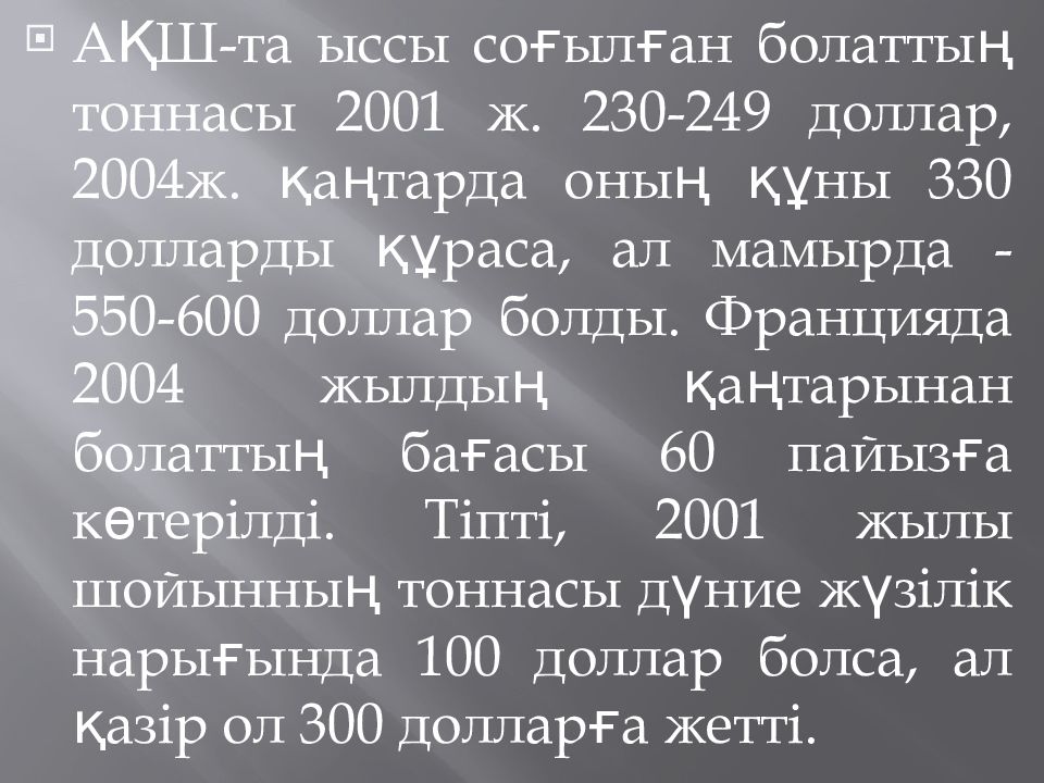 АҚШ-та ыссы соғылған болаттың тоннасы 2001 ж. 230-249 доллар, 2004ж. қаңтарда оның құны 330 долларды құраса, ал мамырда - 550-600 доллар болды. Францияда 2004 жылдың қаңтарынан болаттың бағасы 60 пайызға көтерілді. Тіпті, 2001 жылы шойынның тоннасы дүние жүзілік нарығында 100 доллар болса, ал қазір ол 300 долларға жетті.