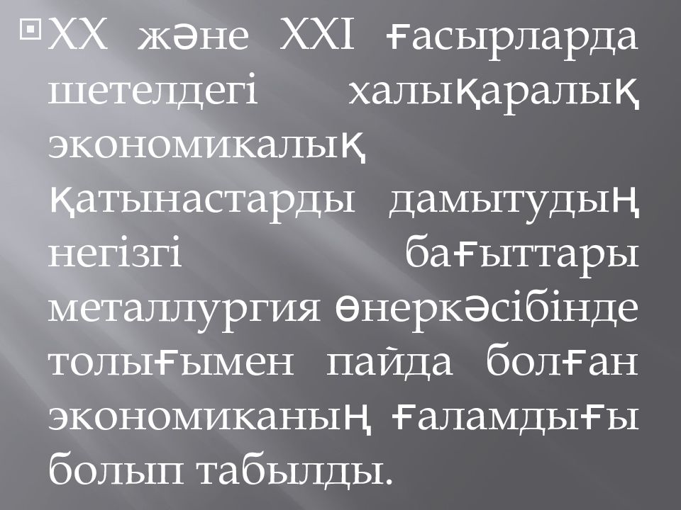 ХХ және ХХІ ғасырларда шетелдегі халықаралық экономикалық қатынастарды дамытудың негізгі бағыттары металлургия өнеркәсібінде толығымен пайда болған экономиканың ғаламдығы болып табылды.