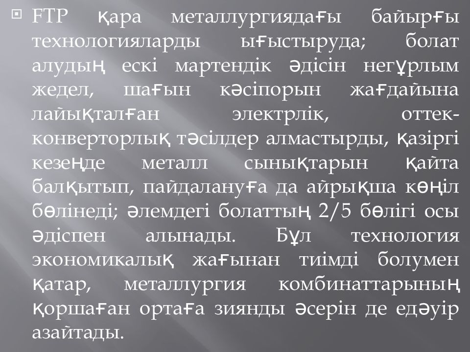 FTP қара металлургиядағы байырғы технологияларды ығыстыруда ; болат алудың ескі мартендік әдісін негұрлым жедел, шағын кәсіпорын жағдайына лайықталған электрлік, оттек- конверторлық тәсілдер алмастырды, қазіргі кезеңде металл сынықтарын қайта балқытып, пайдалануға да айрықша көңіл бөлінеді ; әлемдегі болаттың 2/5 бөлігі осы әдіспен алынады. Бұл технология экономикалық жағынан тиімді болумен қатар, металлургия комбинаттарының қоршаған ортаға зиянды әсерін де едәуір азайтады.