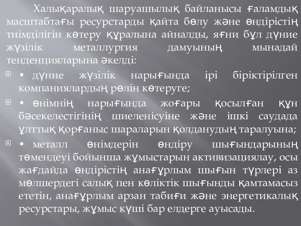 Халықаралық шаруашылық байланысы ғаламдық масштабтағы ресурстарды қайта бөлу және өндірістің тиімділігін көтеру құралына айналды, яғни бұл дүние жүзілік металлургия дамуының мынадай тенденцияларына әкелді : • дүние жүзілік нарығында ірі біріктірілген компаниялардың рөлін көтеруге ; • өнімнің нарығында жоғары қосылған құн бәсекелестігінің шиеленісуіне және ішкі саудада ұлттық қорғаныс шараларын қолданудың таралуына ; • металл өнімдерін өндіру шығындарының төмендеуі бойынша жұмыстарын активизациялау, осы жағдайда өндірістің анағұрлым шығын түрлері аз мөлшердегі салық пен көліктік шығынды қамтамасыз ететін, анағұрлым арзан табиғи және энергетикалық ресурстары, жұмыс күші бар елдерге ауысады.