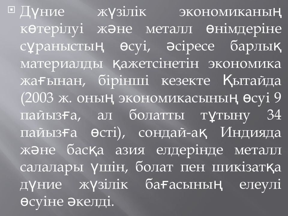 Дүние жүзілік экономиканың көтерілуі және металл өнімдеріне сұраныстың өсуі, әсіресе барлық материалды қажетсінетін экономика жағынан, бірінші кезекте Қытайда (2003 ж. оның экономикасының өсуі 9 пайызға, ал болатты тұтыну 34 пайызға өсті ), сондай-ақ Индияда және басқа азия елдерінде металл салалары үшін, болат пен шикізатқа дүние жүзілік бағасының елеулі өсуіне әкелді.