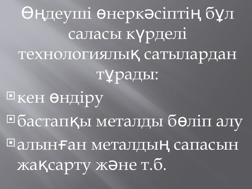 Өңдеуші өнеркәсіптің бұл саласы күрделі технологиялық сатылардан т ұрады: кен өндіру бастапқы металды бөліп алу алынған металдың сапасын жақсарту және т.б.