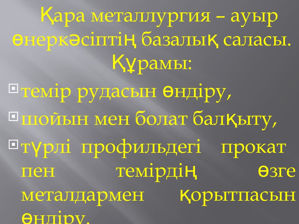 Қара металлургия – ауыр өнеркәсіптің базалық саласы. Құрамы : темір рудасын өндіру, шойын мен болат балқыту, түрлі профильдегі прокат пен темірдің өзге металдармен қорытпасын өндіру.