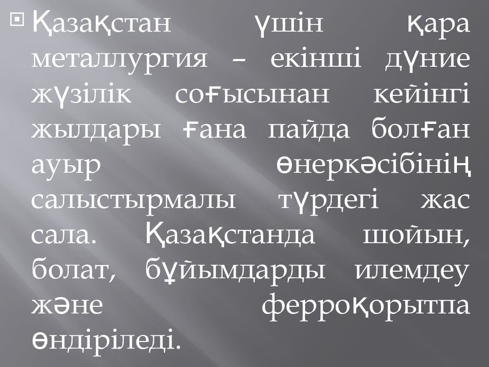Қазақстан үшін қара металлургия – екінші дүние жүзілік соғысынан кейінгі жылдары ғана пайда болған ауыр өнеркәсібінің салыстырмалы түрдегі жас сала. Қазақстанда шойын, болат, бұйымдарды илемдеу және ферроқорытпа өндіріледі.