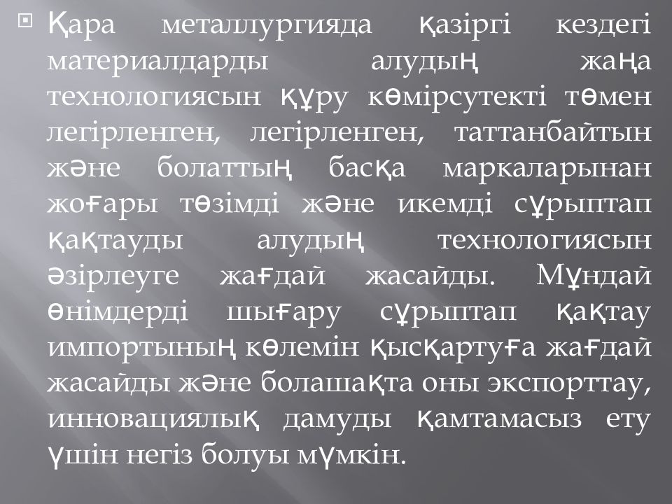Қара металлургияда қазіргі кездегі материалдарды алудың жаңа технологиясын құру көмірсутекті төмен легірленген, легірленген, таттанбайтын және болаттың басқа маркаларынан жоғары төзімді және икемді сұрыптап қақтауды алудың технологиясын әзірлеуге жағдай жасайды. Мұндай өнімдерді шығару сұрыптап қақтау импортының көлемін қысқартуға жағдай жасайды және болашақта оны экспорттау, инновациялық дамуды қамтамасыз ету үшін негіз болуы мүмкін.