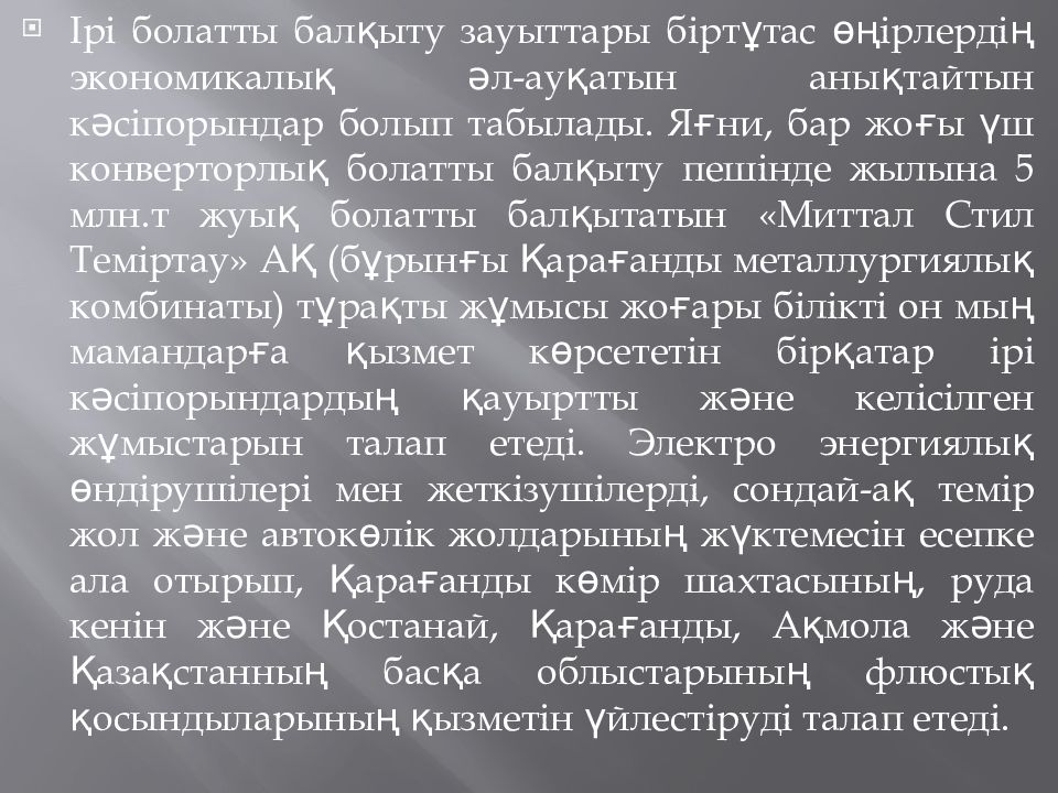 Ірі болатты балқыту зауыттары біртұтас өңірлердің экономикалық әл-ауқатын анықтайтын кәсіпорындар болып табылады. Яғни, бар жоғы үш конверторлық болатты балқыту пешінде жылына 5 млн.т жуық болатты балқытатын « Миттал Стил Теміртау » АҚ ( бұрынғы Қарағанды металлургиялық комбинаты) тұрақты жұмысы жоғары білікті он мың мамандарға қызмет көрсететін бірқатар ірі кәсіпорындардың қауыртты және келісілген жұмыстарын талап етеді. Электро энергиялық өндірушілері мен жеткізушілерді, сондай-ақ темір жол және автокөлік жолдарының жүктемесін есепке ала отырып, Қарағанды көмір шахтасының, руда кенін және Қостанай, Қарағанды, Ақмола және Қазақстанның басқа облыстарының флюстық қосындыларының қызметін үйлестіруді талап етеді.