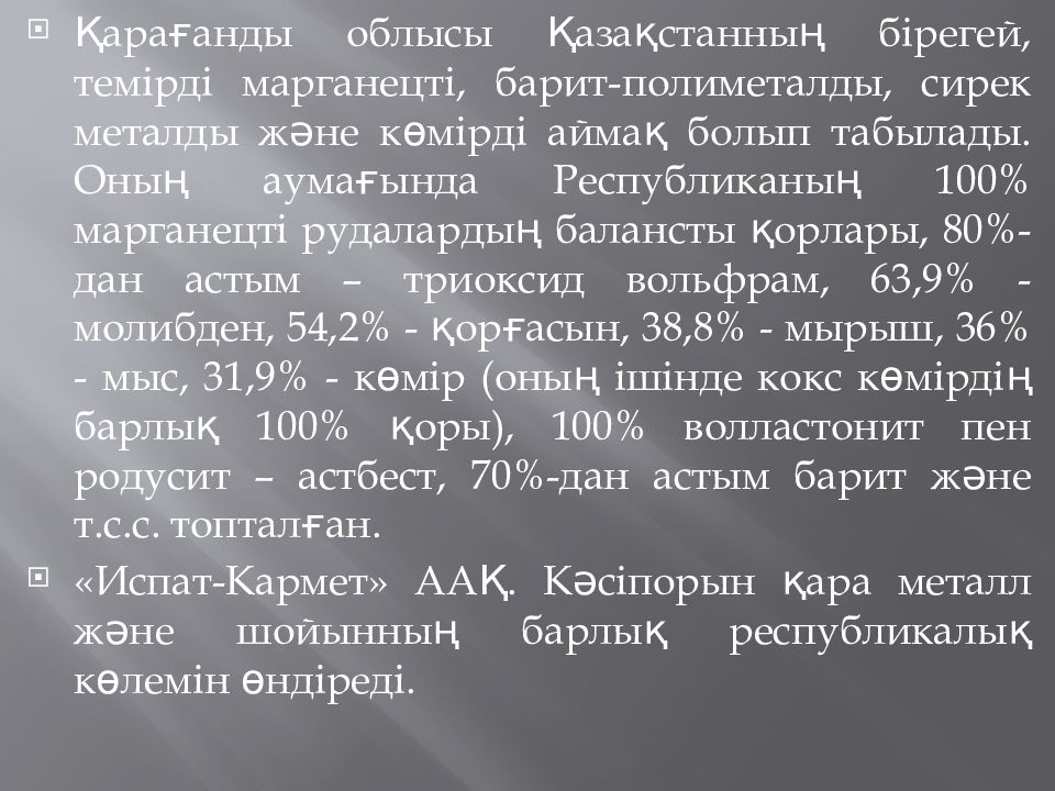Қарағанды облысы Қазақстанның бірегей, темірді марганецті, барит- полиметалды, сирек металды және көмірді аймақ болып табылады. Оның аумағында Республиканың 100% марганецті рудалардың балансты қорлары, 80%-дан астым – триоксид вольфрам, 63,9% - молибден, 54,2% - қорғасын, 38,8% - мырыш, 36% - мыс, 31,9% - көмір ( оның ішінде кокс көмірдің барлық 100% қоры ), 100% волластонит пен родусит – астбест, 70%-дан астым барит және т.с.с. топталған. « Испат-Кармет » ААҚ. Кәсіпорын қара металл және шойынның барлық республикалық көлемін өндіреді.