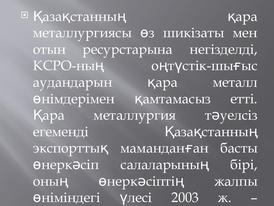 Қазақстанның қара металлургиясы өз шикізаты мен отын ресурстарына негізделді, КСРО- ның оңтүстік-шығыс аудандарын қара металл өнімдерімен қамтамасыз етті. Қара металлургия тәуелсіз егеменді Қазақстанның экспорттық маманданған басты өнеркәсіп салаларының бірі, оның өнеркәсіптің жалпы өніміндегі үлесі 2003 ж. – 8,0%(1997 ж. –5,8%).