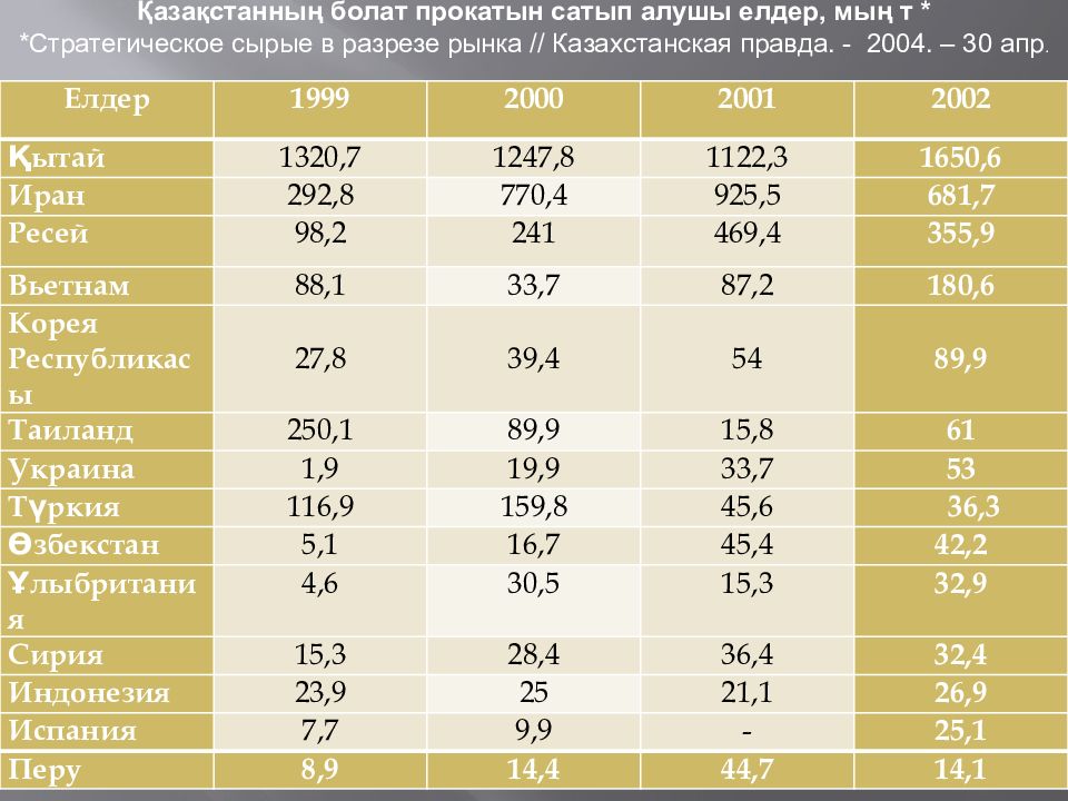 Елдер 1999 2000 2001 2002 Қытай 1320,7 1247,8 1122,3 1650,6 Иран 292,8 770,4 925,5 681,7 Ресей 98,2 241 469,4 355,9 Вьетнам 88,1 33,7 87,2 180,6 Корея Республикасы 27,8 39,4 54 89,9 Таиланд 250,1 89,9 15,8 61 Украина 1,9 19,9 33,7 53 Түркия 116,9 159,8 45,6 36,3 Өзбекстан 5,1 16,7 45,4 42,2 Ұлыбритания 4,6 30,5 15,3 32,9 Сирия 15,3 28,4 36,4 32,4 Индонезия 23,9 25 21,1 26,9 Испания 7,7 9,9 - 25,1 Перу 8,9 14,4 44,7 14,1 Қазақстанның болат прокатын сатып алушы елдер, мың т * * Стратегическое сырые в разрезе рынка // Казахстанская правда. - 2004. – 30 апр.