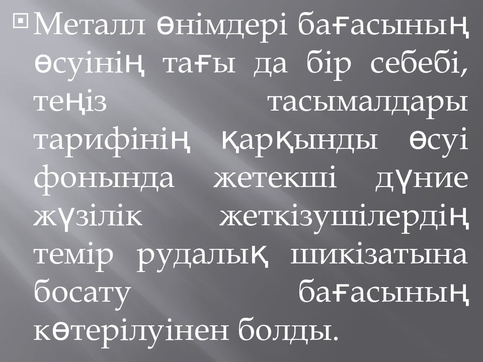 Металл өнімдері бағасының өсуінің тағы да бір себебі, теңіз тасымалдары тарифінің қарқынды өсуі фонында жетекші дүние жүзілік жеткізушілердің темір рудалық шикізатына босату бағасының көтерілуінен болды.