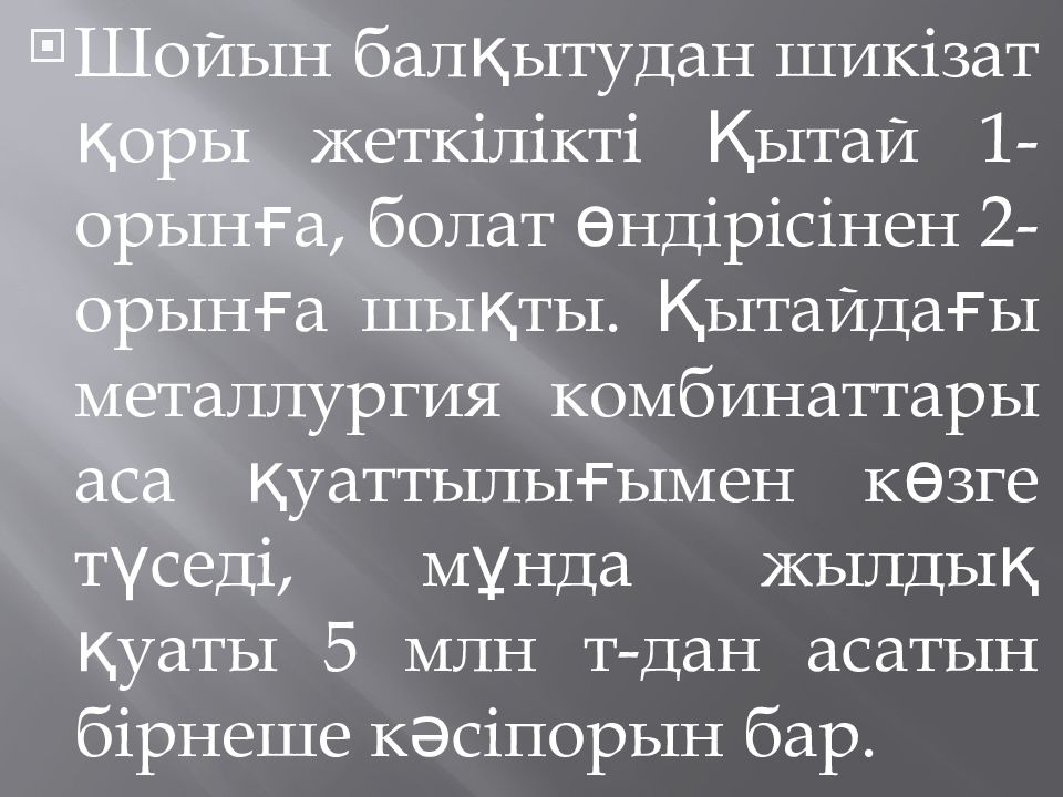 Шойын балқытудан шикізат қоры жеткілікті Қытай 1-орынға, болат өндірісінен 2-орынға шықты. Қытайдағы металлургия комбинаттары аса қуаттылығымен көзге түседі, мұнда жылдық қуаты 5 млн т-дан асатын бірнеше кәсіпорын бар.