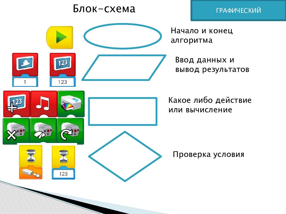 ГРАФИЧЕСКИЙ Начало и конец алгоритма Ввод данных и вывод результатов Какое либо действие или вычисление Проверка условия