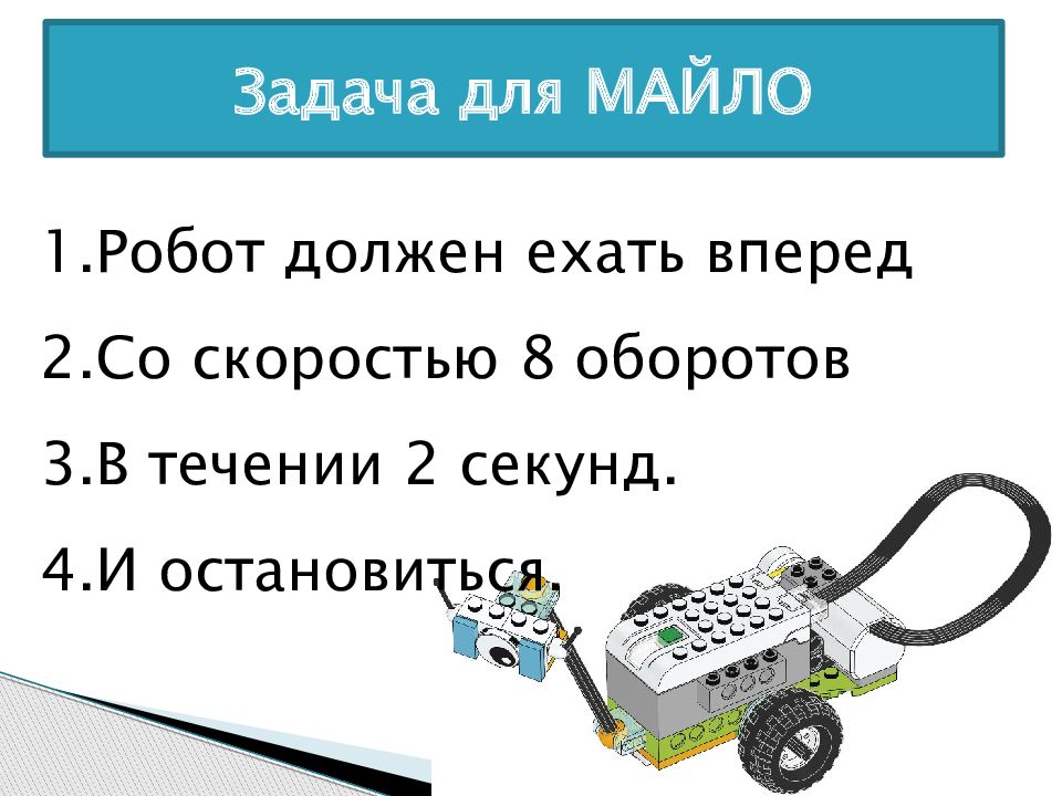 Задача для МАЙЛО Робот должен ехать вперед Со скоростью 8 оборотов В течении 2 секунд. И остановиться.