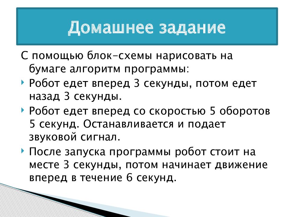 С помощью блок-схемы нарисовать на бумаге алгоритм программы: Робот едет вперед 3 секунды, потом едет назад 3 секунды. Робот едет вперед со скоростью 5 оборотов 5 секунд. Останавливается и подает звуковой сигнал. После запуска программы робот стоит на месте 3 секунды, потом начинает движение вперед в течение 6 секунд. Домашнее задание