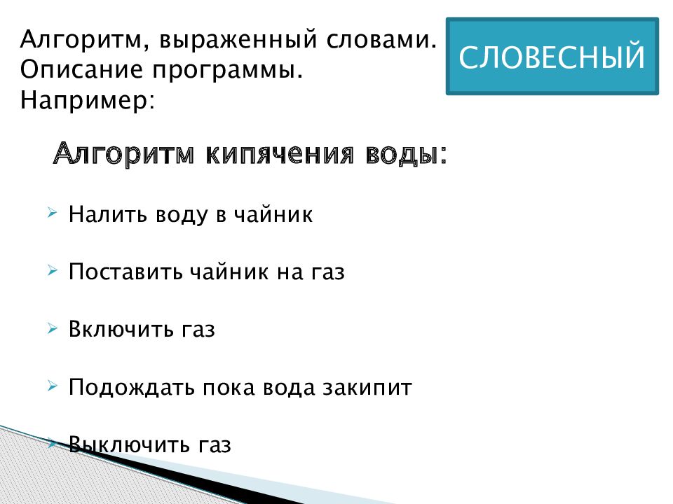 СЛОВЕСНЫЙ Алгоритм, выраженный словами. Описание программы. Например: Алгоритм кипячения воды: Налить воду в чайник Поставить чайник на газ Включить газ Подождать пока вода закипит Выключить газ