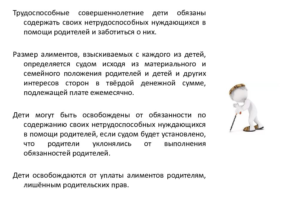 Трудоспособные совершеннолетние дети обязаны содержать своих нетрудоспособных нуждающихся в помощи родителей и заботиться о них. Размер алиментов, взыскиваемых с каждого из детей, определяется судом исходя из материального и семейного положения родителей и детей и других интересов сторон в твёрдой денежной сумме, подлежащей плате ежемесячно. Дети могут быть освобождены от обязанности по содержанию своих нетрудоспособных нуждающихся в помощи родителей, если судом будет установлено, что родители уклонялись от выполнения обязанностей родителей. Дети освобождаются от уплаты алиментов родителям, лишённым родительских прав.