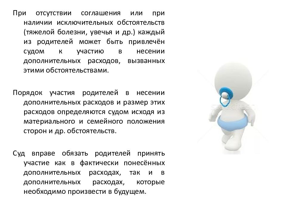 При отсутствии соглашения или при наличии исключительных обстоятельств (тяжелой болезни, увечья и др.) каждый из родителей может быть привлечён судом к участию в несении дополнительных расходов, вызванных этими обстоятельствами. Порядок участия родителей в несении дополнительных расходов и размер этих расходов определяются судом исходя из материального и семейного положения сторон и др. обстоятельств. Суд вправе обязать родителей принять участие как в фактически понесённых дополнительных расходах, так и в дополнительных расходах, которые необходимо произвести в будущем.