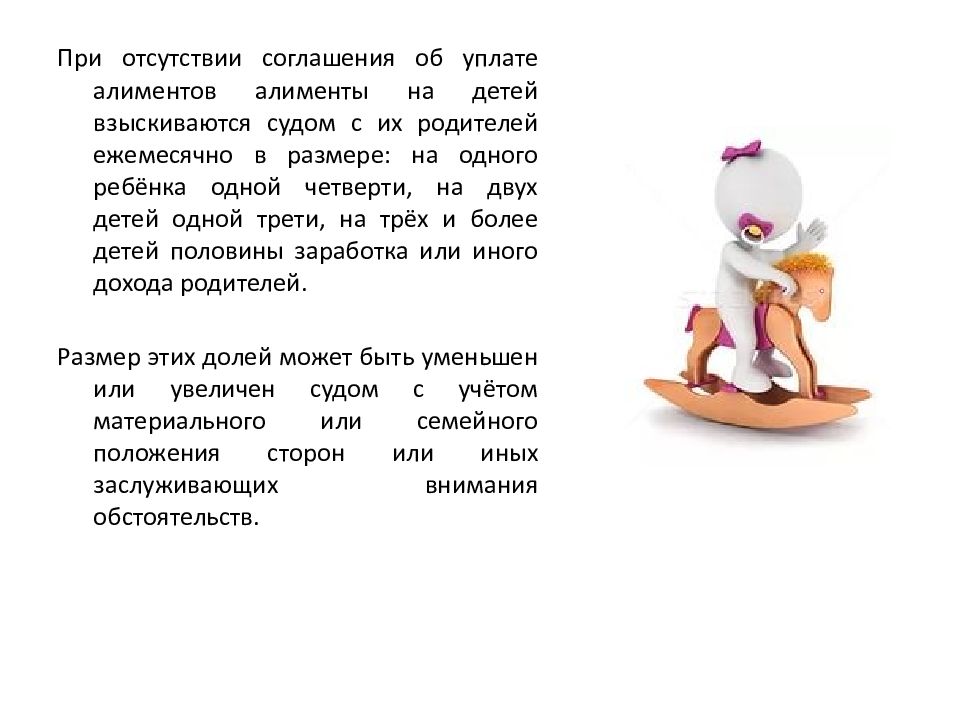 При отсутствии соглашения об уплате алиментов алименты на детей взыскиваются судом с их родителей ежемесячно в размере: на одного ребёнка одной четверти, на двух детей одной трети, на трёх и более детей половины заработка или иного дохода родителей. Размер этих долей может быть уменьшен или увеличен судом с учётом материального или семейного положения сторон или иных заслуживающих внимания обстоятельств.