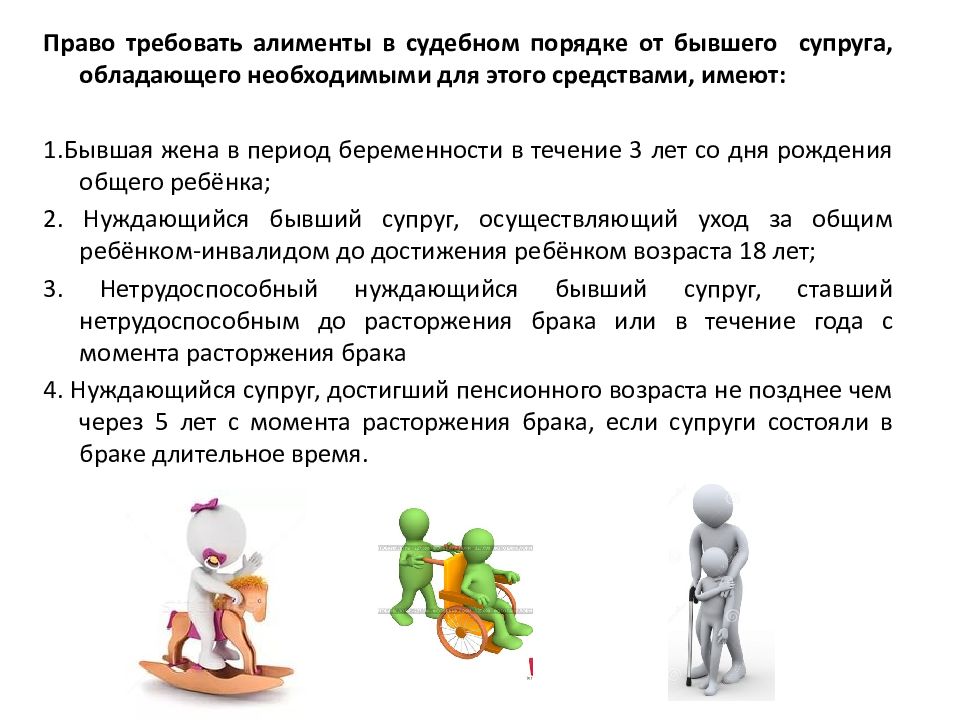 Право требовать алименты в судебном порядке от бывшего супруга, обладающего необходимыми для этого средствами, имеют: 1.Бывшая жена в период беременности в течение 3 лет со дня рождения общего ребёнка; 2. Нуждающийся бывший супруг, осуществляющий уход за общим ребёнком-инвалидом до достижения ребёнком возраста 18 лет; 3. Нетрудоспособный нуждающийся бывший супруг, ставший нетрудоспособным до расторжения брака или в течение года с момента расторжения брака 4. Нуждающийся супруг, достигший пенсионного возраста не позднее чем через 5 лет с момента расторжения брака, если супруги состояли в браке длительное время.
