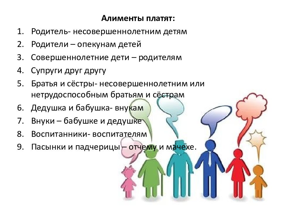 Алименты платят: Родитель- несовершеннолетним детям Родители – опекунам детей Совершеннолетние дети – родителям Супруги друг другу Братья и сёстры- несовершеннолетним или нетрудоспособным братьям и сёстрам Дедушка и бабушка- внукам Внуки – бабушке и дедушке Воспитанники- воспитателям Пасынки и падчерицы – отчему и мачехе.