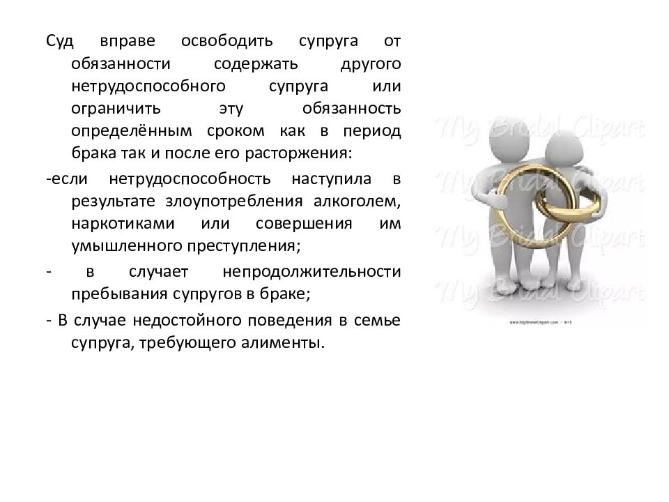 Суд вправе освободить супруга от обязанности содержать другого нетрудоспособного супруга или ограничить эту обязанность определённым сроком как в период брака так и после его расторжения: -если нетрудоспособность наступила в результате злоупотребления алкоголем, наркотиками или совершения им умышленного преступления; - в случает непродолжительности пребывания супругов в браке; - В случае недостойного поведения в семье супруга, требующего алименты.