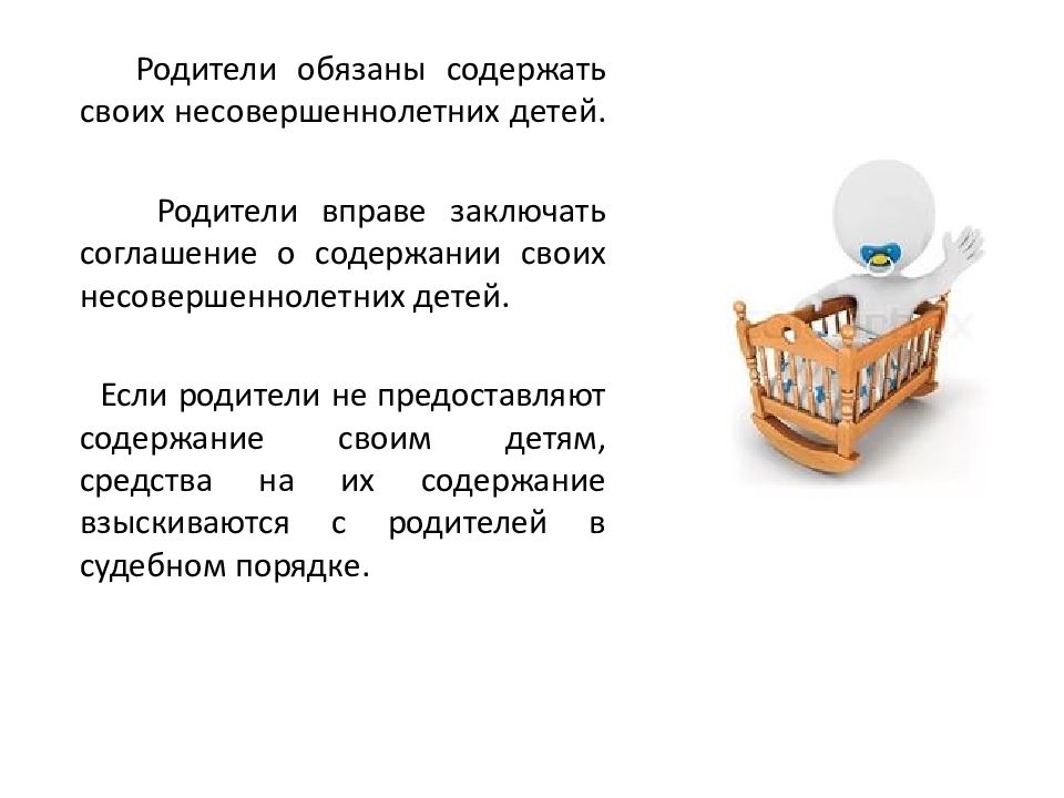 Родители обязаны содержать своих несовершеннолетних детей. Родители вправе заключать соглашение о содержании своих несовершеннолетних детей. Если родители не предоставляют содержание своим детям, средства на их содержание взыскиваются с родителей в судебном порядке.