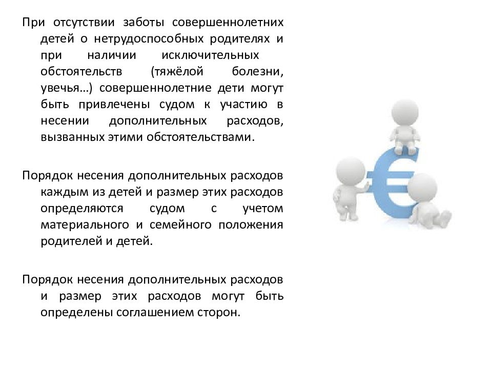 При отсутствии заботы совершеннолетних детей о нетрудоспособных родителях и при наличии исключительных обстоятельств (тяжёлой болезни, увечья…) совершеннолетние дети могут быть привлечены судом к участию в несении дополнительных расходов, вызванных этими обстоятельствами. Порядок несения дополнительных расходов каждым из детей и размер этих расходов определяются судом с учетом материального и семейного положения родителей и детей. Порядок несения дополнительных расходов и размер этих расходов могут быть определены соглашением сторон.