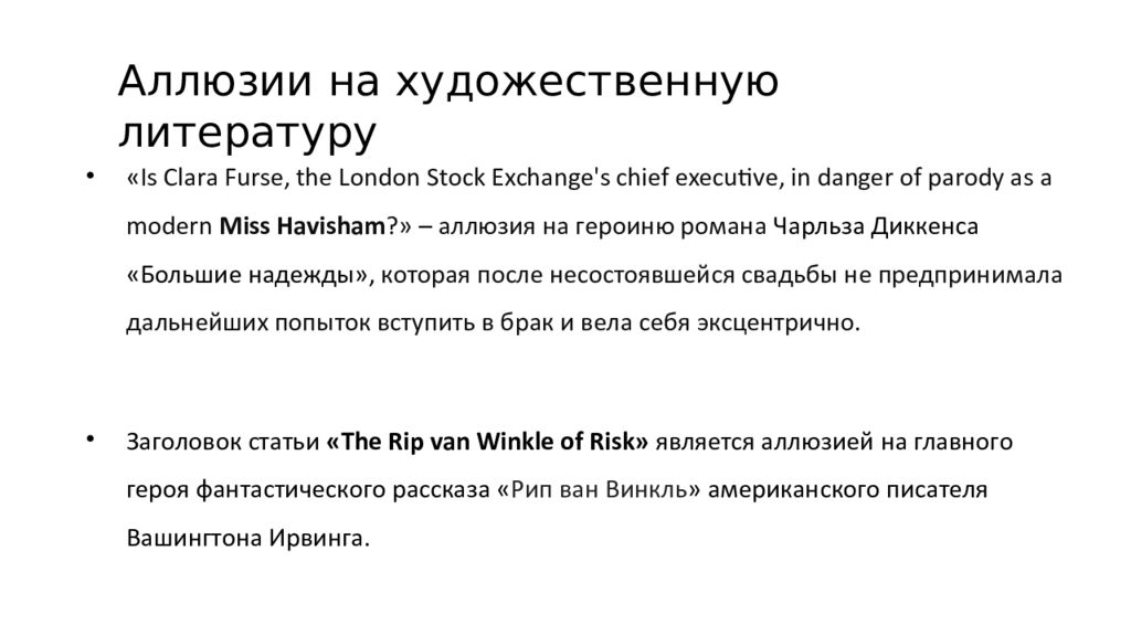 « Is Clara Furse, the London Stock Exchange's chief executive, in danger of parody as a modern Miss Havisham ?» – аллюзия на героиню романа Чарльза Диккенса «Большие надежды», которая после несостоявшейся свадьбы не предпринимала дальнейших попыток вступить в брак и вела себя эксцентрично. Заголовок статьи «The Rip van Winkle of Risk» является аллюзией на главного героя фантастического рассказа « Рип ван Винкль » американского писателя Вашингтона Ирвинга. Аллюзии на художественную литературу