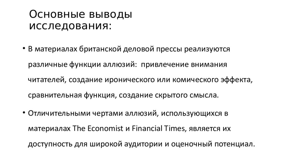 Основные выводы исследования: В материалах британской деловой прессы реализуются различные функции аллюзий: привлечение внимания читателей, создание иронического или комического эффекта, сравнительная функция, создание скрытого смысла. Отличительными чертами аллюзий, использующихся в материалах The Economist и Financial Times, является их доступность для широкой аудитории и оценочный потенциал.