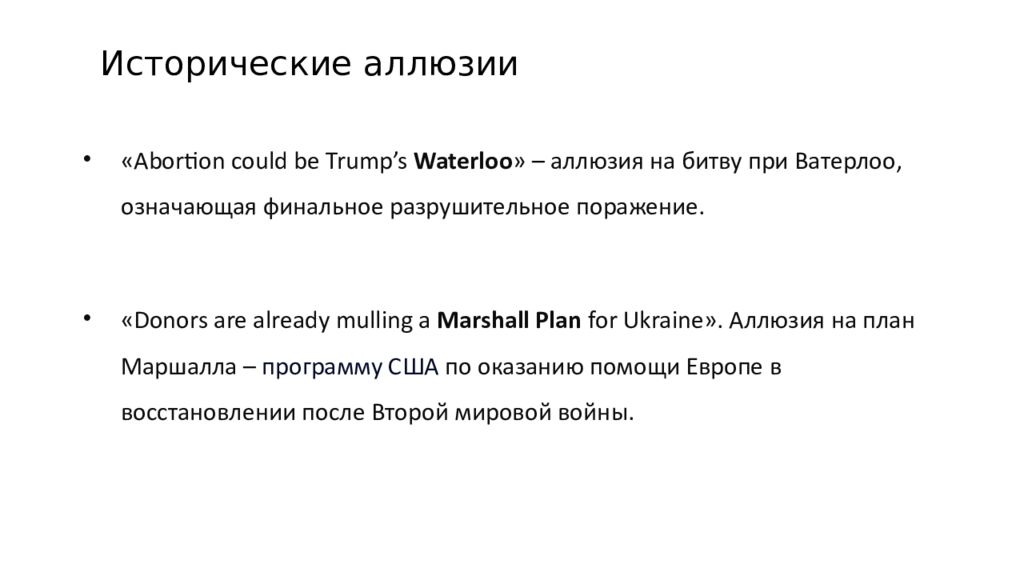 « Abortion could be Trump ’ s Waterloo » – аллюзия на битву при Ватерлоо, означающая финальное разрушительное поражение. «Donors are already mulling a Marshall Plan for Ukraine». Аллюзия на п лан Маршалла – программу США по оказанию помощи Европе в восстановлении после Второй мировой войны. Исторические аллюзии